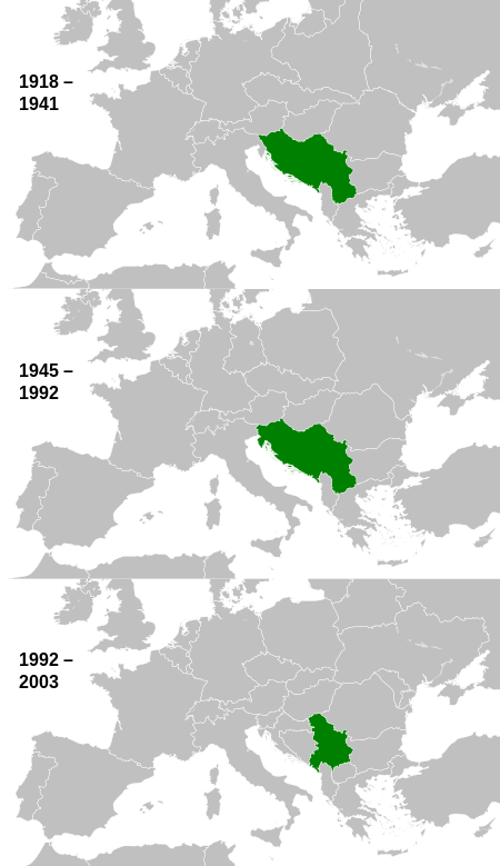 Zu unterscheiden sind das Königreich Jugoslawien (1918–1941, heute auch Erstes Jugoslawien genannt) und das sozialistische Zweite Jugoslawien (amtlich Sozialistische Föderative Republik Jugoslawien, 1943/45–1991/92) sowie die aus Serbien und Montenegro bestehende Bundesrepublik Jugoslawien (1992–2003). Von 2003 bis 2006 bildeten die verbliebenen Teilrepubliken Serbien und Montenegro den Staatenbund Serbien und Montenegro, der sich im territorialen und völkerrechtlichen Umfang nicht von der Bundesrepublik Jugoslawien unterschied. Beide wurden auch „Restjugoslawien“ genannt.